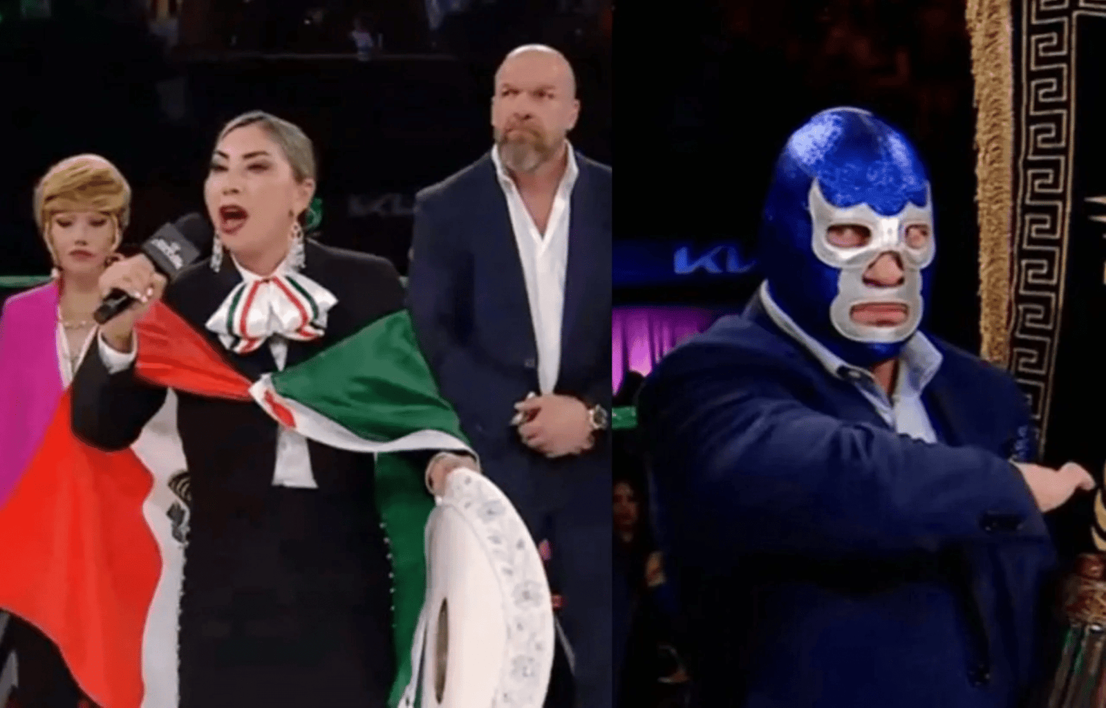 Otra de las imágenes que quedó para la historia fue cuando la cantante se equivocaba al entonar el Himno Nacional de México, la reacción de Blue Demon Jr., quien se encontraba entre las celebridades dentro del cuadrilátero y no oculto su gesto y se pudo apreciar los ojos de admiración por el error, aspecto que los internautas no han dejado pasar y que se ha hecho viral.